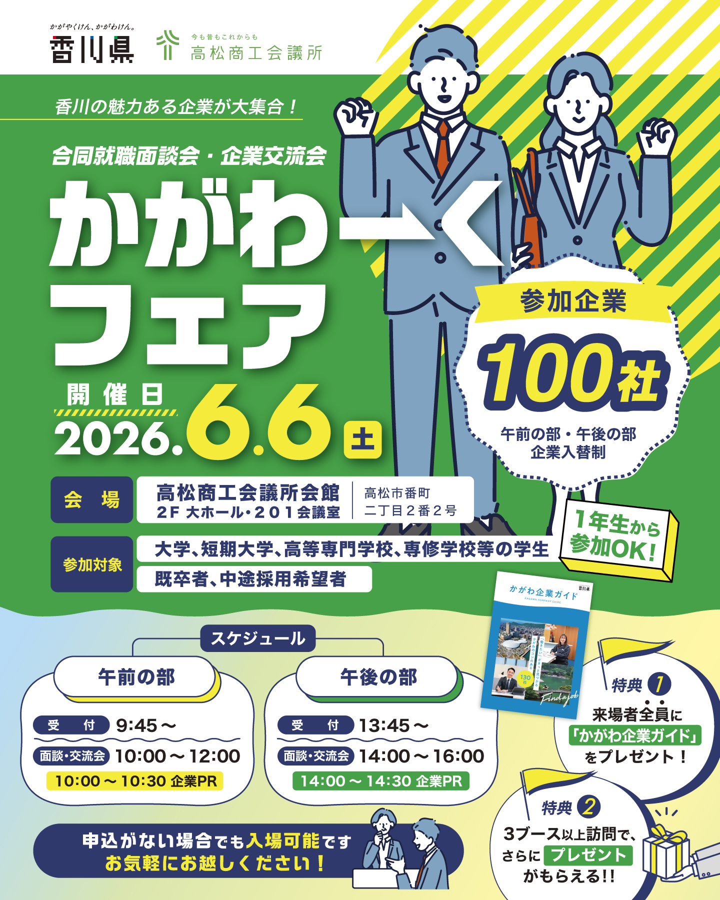 6月6日(土)に開催される就職イベント『かがわーくフェア』(主催:香川県・高松商工会議所)に出展いたします。